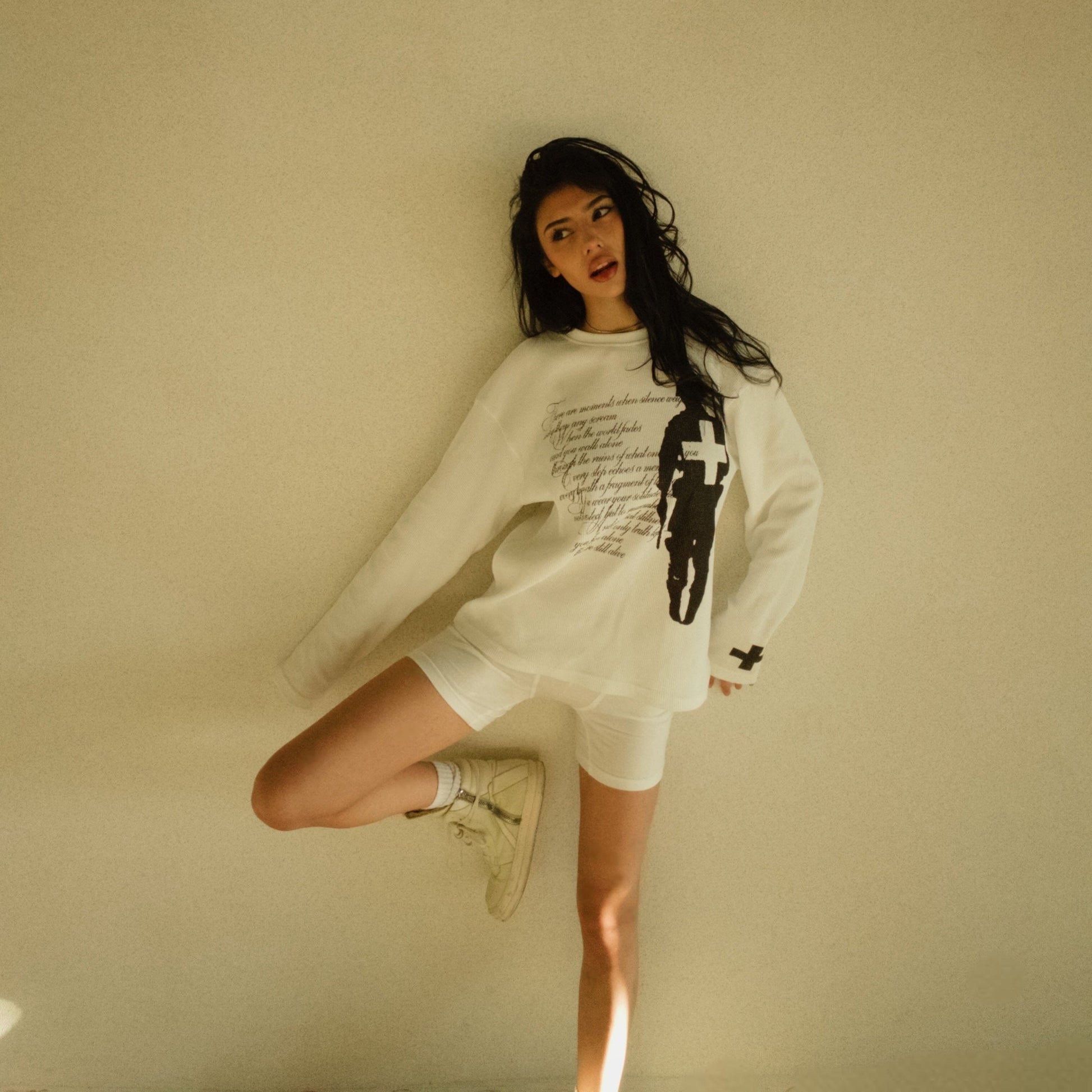 The longsleeve is made of 100% waffle cotton and features two screen prints and a personalized brand label.